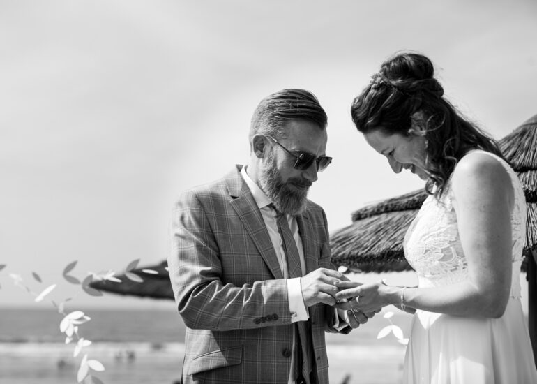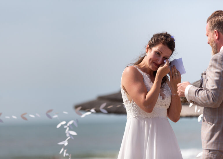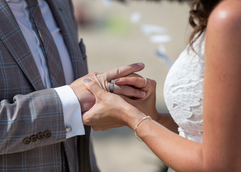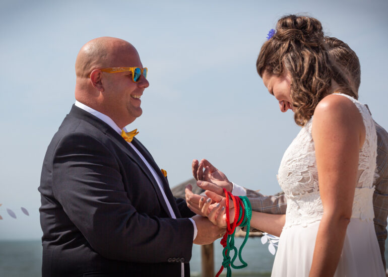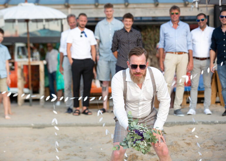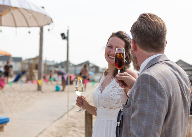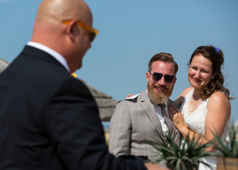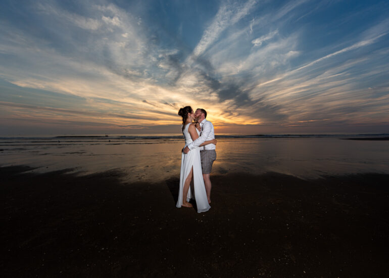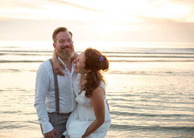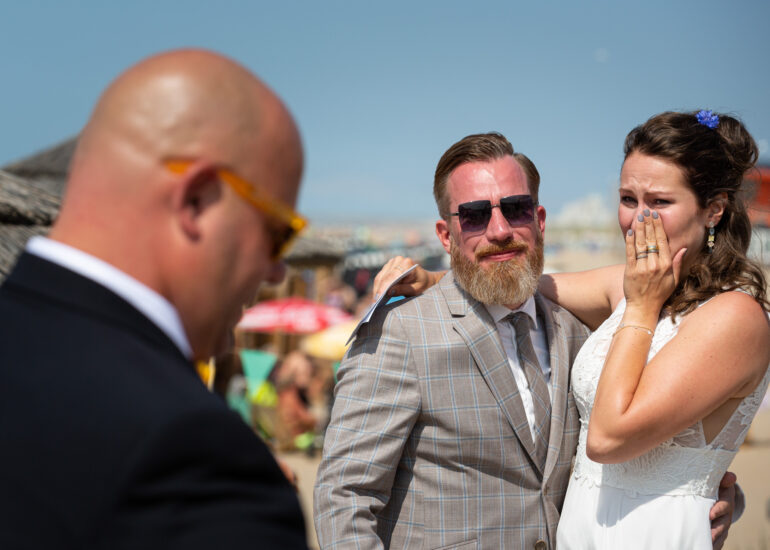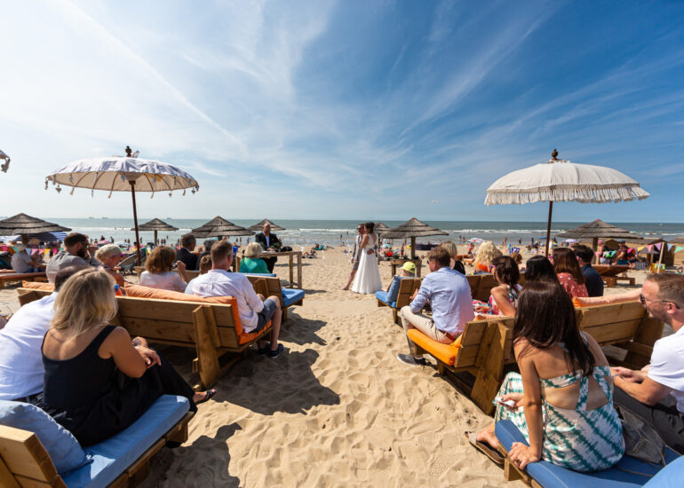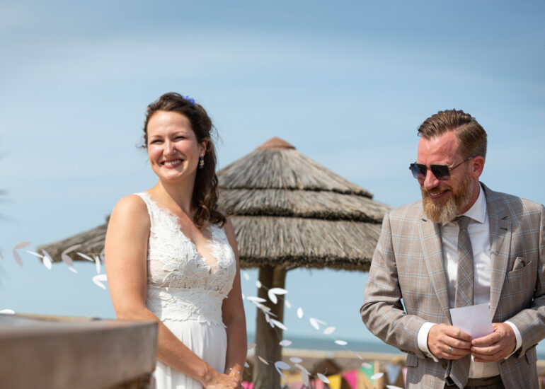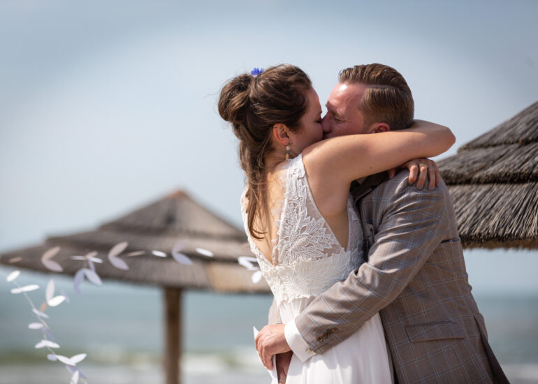Am weißen Sandstrand vor der Bar Paal14 in Katwijk, Niederlande, habe ich am Samstag, den 23. Juli 2022, dieses großartige Paar fotografiert, als sie sich das Ja-Wort vor Ihren engsten Freunden und der Familie gegeben haben. Ein wundervoller Sonnenuntergang krönte den Hochzeitstag der Beiden.